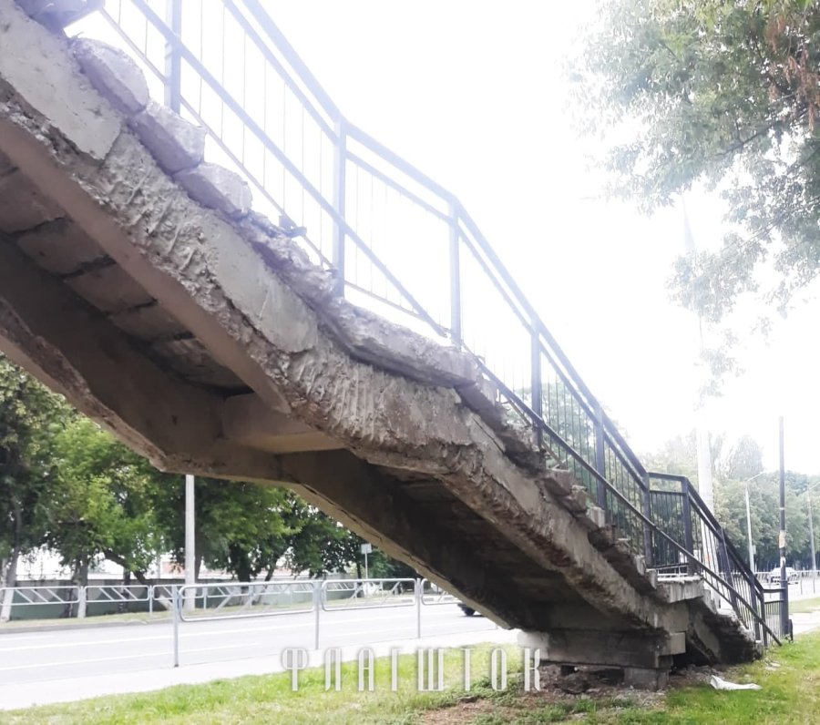 3. Пешеходный путепровод между ул. Фадеева и Кирова. Построен в 1987 году. Лестничные марши путепровода лишились верхнего слоя бетона и находятся в аварийном состоянии. Когда начнутся работы на самом путепроводе, государственные структуры не сообщают, публичные закупки не объявлялись.