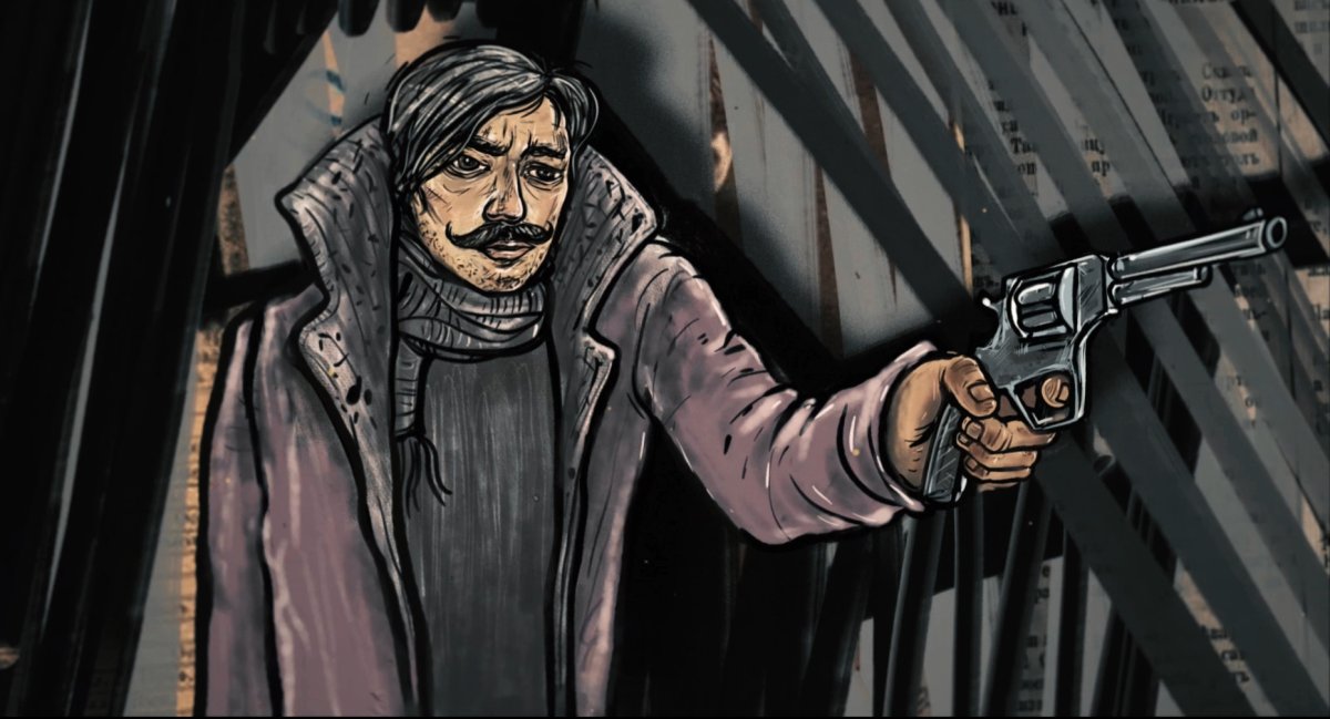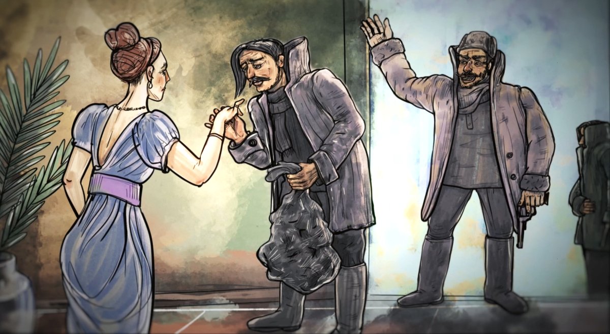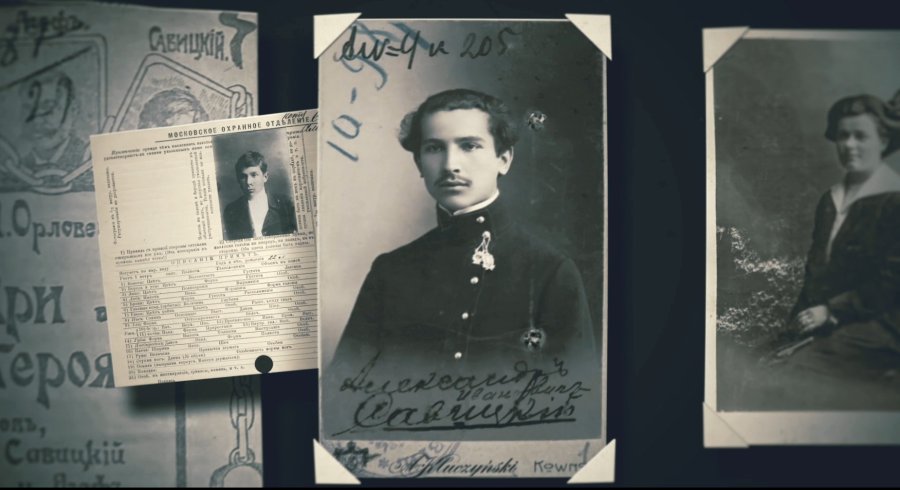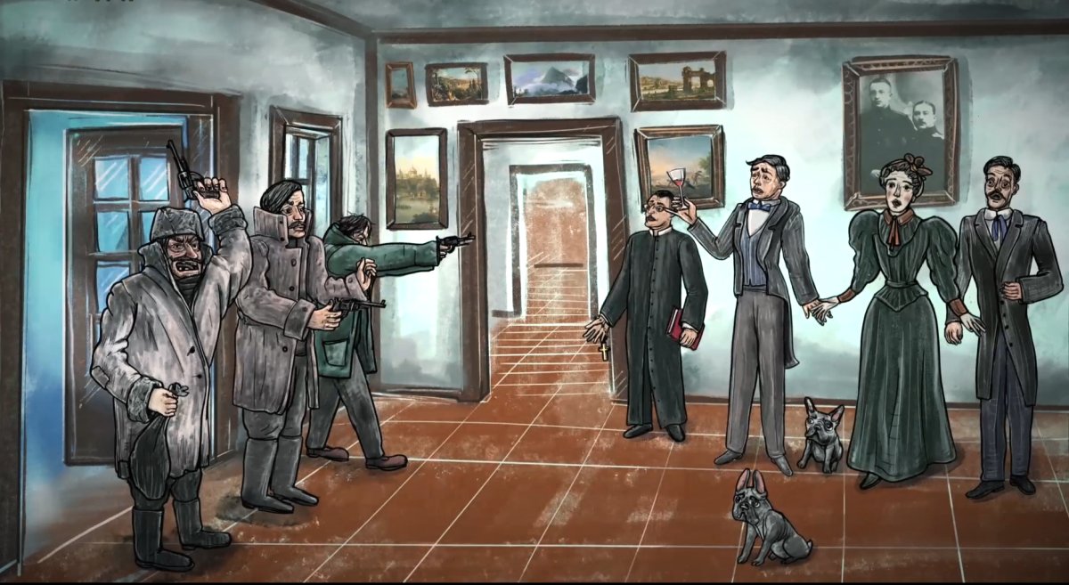 «"Рукі ўгору!”… Олек абярнуўся і ўбачыў, што ў салоне з тузін узброеных рэвальверамі бандытаў. Савіцкі звярнуўся да ўсіх ветліва, але цвёрда папрасіў аддаць грошы, гадзіннікі, біжутэрыю.