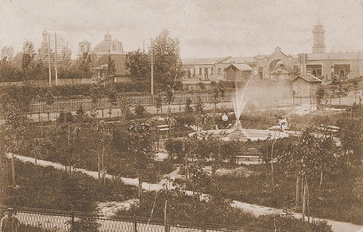 Па перыметру сквера паміж сённяшнімі вуліцамі Ланге і Білецкага раней знаходзілася заможная цагляная забудова. Вугал двух тагачасных вуліц — барона Нолькена і Мільённай — завяршал асабняк, пабудаваны яшчэ ў часы Мікалая Румянцава.