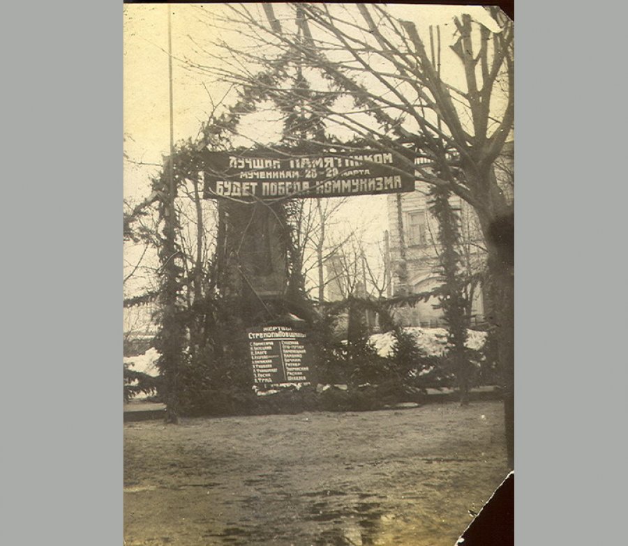 Пасля падаўлення Стракапытаўскага антысавецкага паўстання гомельскія чэкісты размясцілі ў скверы брацкую магілу загінулым камунарам і назвалі яго «сквер 25 сакавіка» — гэта дата абароны бальшавікамі гасцініцы «Савой» ад «стракапытаўцаў». У 1950-х гадах у скверы размясціўся будынак МГБ (сёння КДБ), а таксама з'явіўся помнік Феліксу Дзяржынкаму. Гомельскія чэкісты часта яго так і называюць — сквер Дзяржынскага. Хоць і афіцыйнай назвы сёння ён не мае.