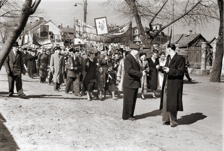 1958 год. Ленін і партыйныя кіраўнікі на палках у калоне па вуліцы Сялянскай