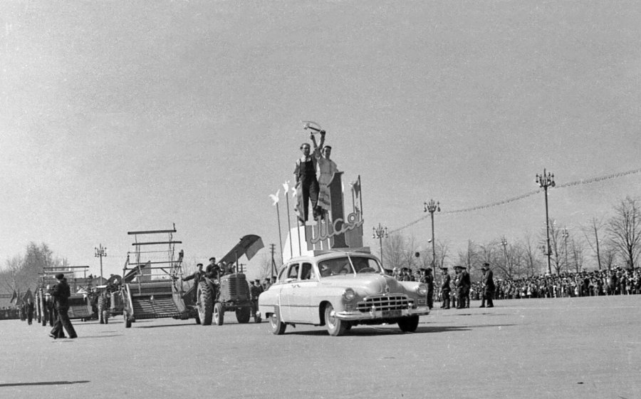 1957 ці 1958 год. «Жывы помнік» рабочаму і калгасніцы на даху аўтамабіля ЗіМ