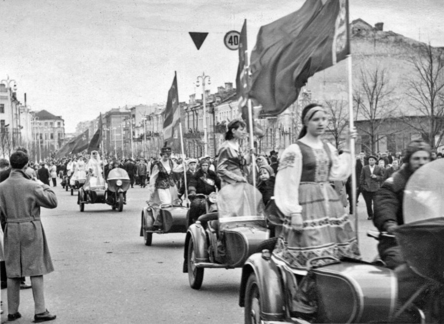 1960-я. Дзяўчыны ў мотакалясках са сцягамі саюзных краін СССР