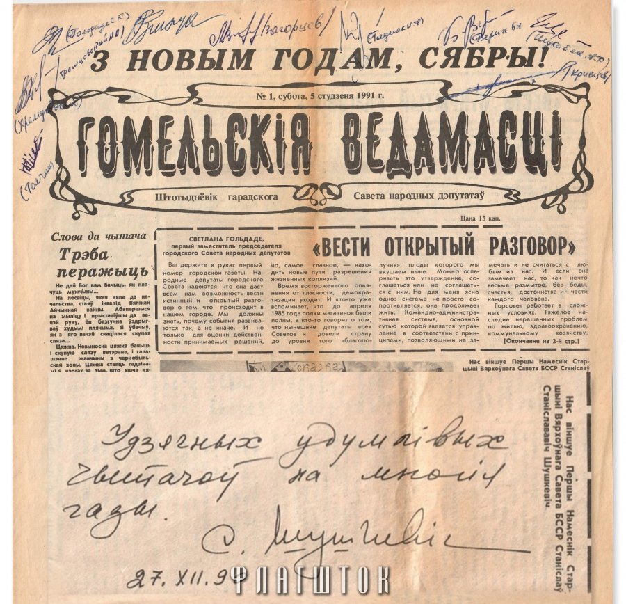 Першы нумар газеты «Гомельскія ведамасці» з подпісам Станіслава Шушкевіча
