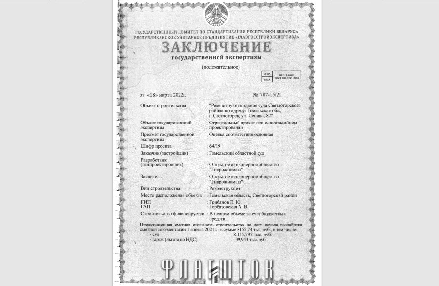 18 марта 2022 года РУП «Главстройэкспертиза» выдало положительное заключение на реконструкцию суда Светлогорского района. Общая сметная стоимость строительства объекта в ценах на 1 апреля 2021 года составляет 8 155 740 BYN. Строительство будет финансироваться в полном объеме за счет бюджетных средств. Предполагается, что на эти цели будут использованы средства, взыскиваемые с принудительных сборов.
