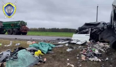 А вот и «трактор-убийца» c повреждённым прицепом, в который вчера вечером в Светлогорском районе врезалось маршрутное такси