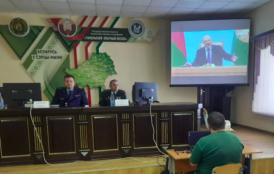 По фотоотчету на сайте лесхоза видно, что речь прокурора сопровождалась демонстрацией видеоролика с выступлением Александра Лукашенко.