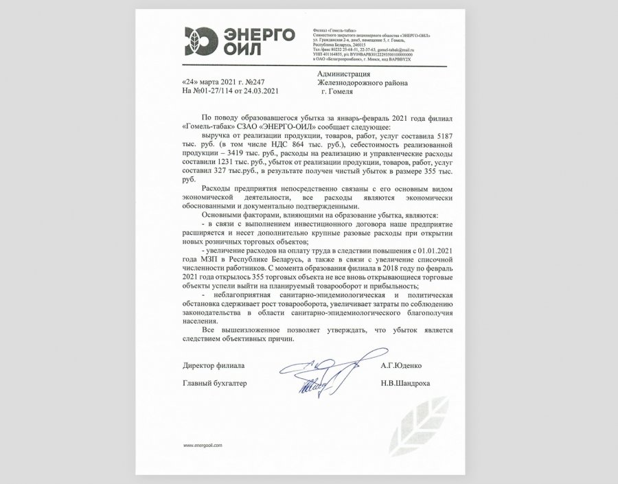Активная переписка между филиалом «Гомель-табак» СЗАО «Энерго-Оил» и администрацией Железнодорожного Гомеля началась в январе 2020 года, когда бухгалтерия предприятия впервые зафиксировала убытки. С тех пор предприятие регулярно отправляло чиновникам письма с объяснениями причин убытков и обещаниями выхода на безубыточную работу. Причем предполагаемый срок выхода на безубыточную работу постоянно смещается. Сначала безубыточность обещали достичь к концу прошлого года. Потом срок сместили на 2021 год, теперь уже обещают на 2022 год.