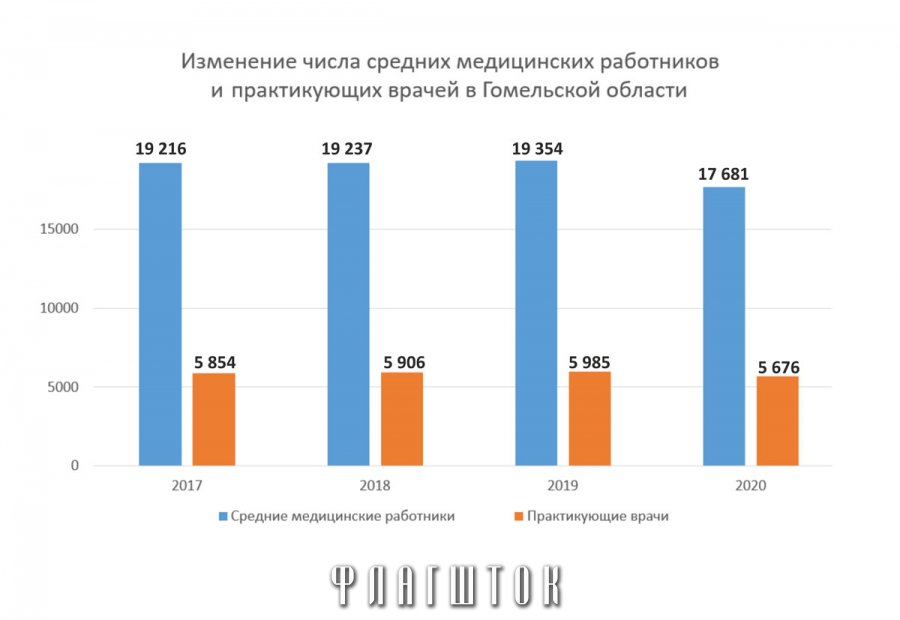 Ранее Флагшток разбирал официальную статистику по Гомельской области. В 2020 году в сравнении с 2019 годом количество практикующих врачей снизилось на 309 человек, средних медицинских работников (фельдшеры, медсестры, акушеры, зубные врачи, дантисты) — на 1673.