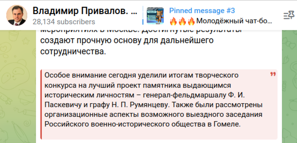 Привалов также анонсировал «возможное выездное заседание Российского военно-исторического общества в Гомеле».