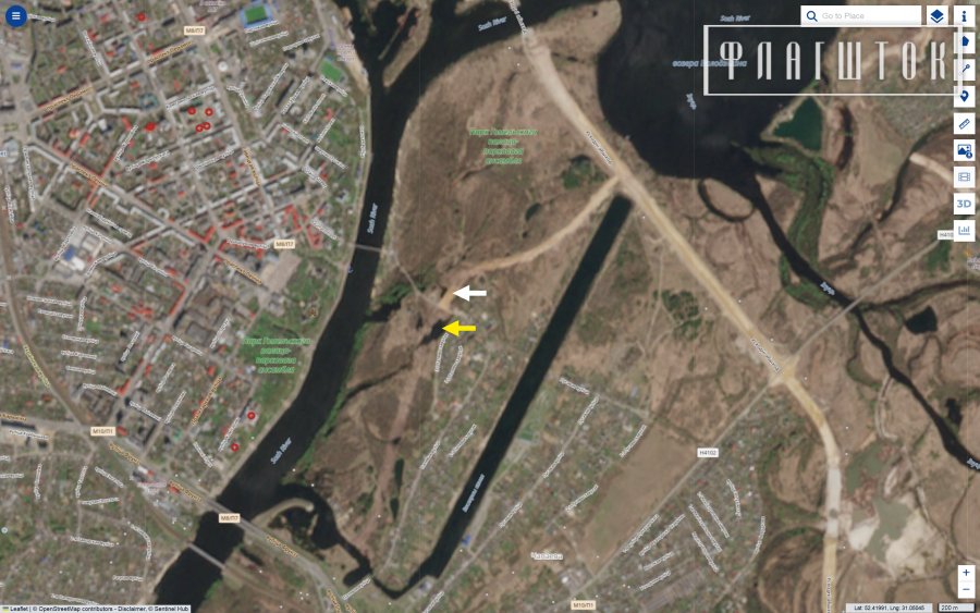 Белая стрелка: уже ликвидированное озеро. Желтая стрелка: подлежащее ликвидации. Визуализация Флагштока