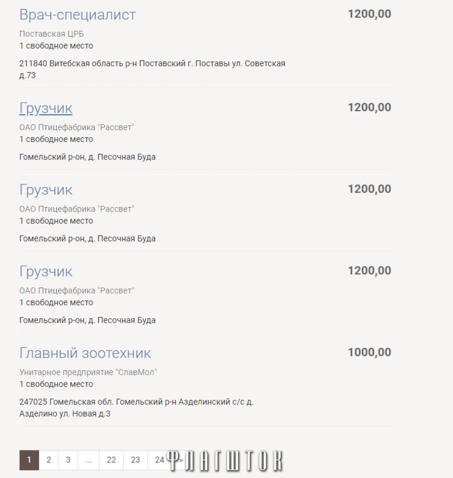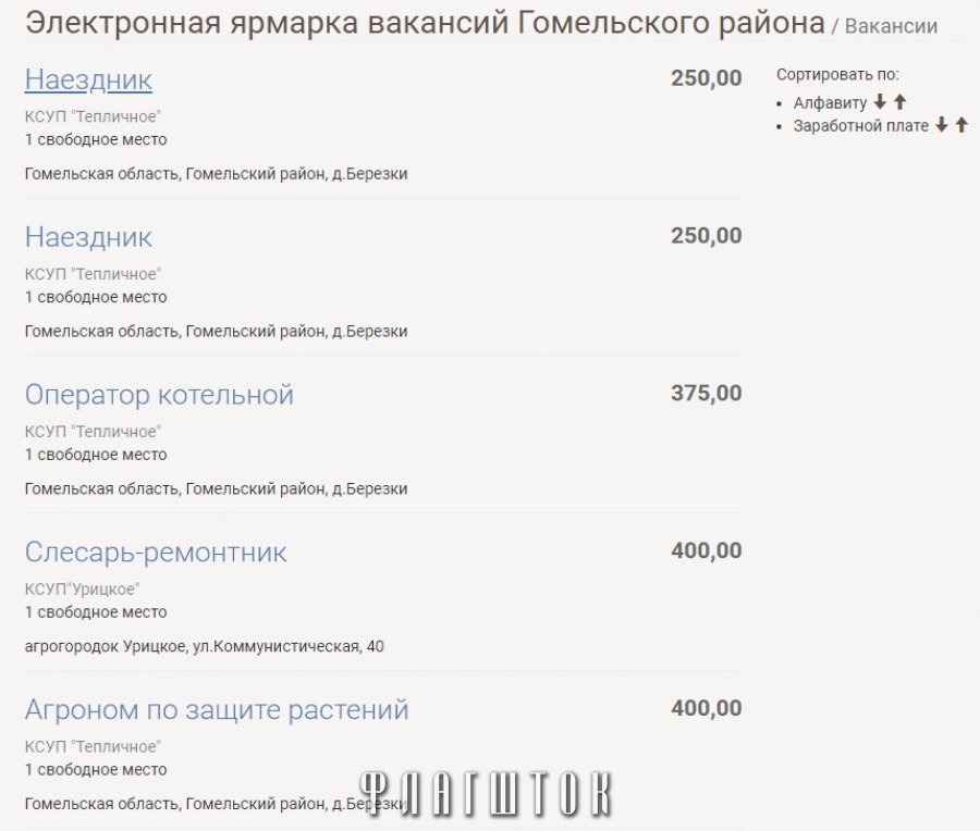 Среди предприятий Гомельского района самыми высокооплачиваемыми оказались вакансии грузчиков ОАО «Птицефабрики «Рассвет». Предприятие, входящее в пятерку самых убыточных акционерных обществ Гомельской области, предложило три вакансии грузчиков с зарплатой 1200 рублей.