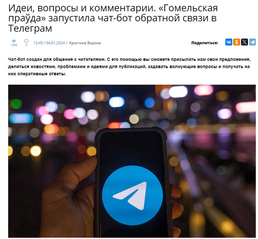 В конце 2023 — начале 2024 года все печатные издания местных органов власти Гомельской области синхронно обзавелись чат-ботами Telegram. По задумке новый канал связи должен был дать возможность местным жителям поделиться своей новостью и выступить с предложением темы для публикации. Чат-боты по сути стали единственной формой обратной связи с читателями, поскольку комментарии в основных Telegram-каналах госСМИ, как правило, отключены.