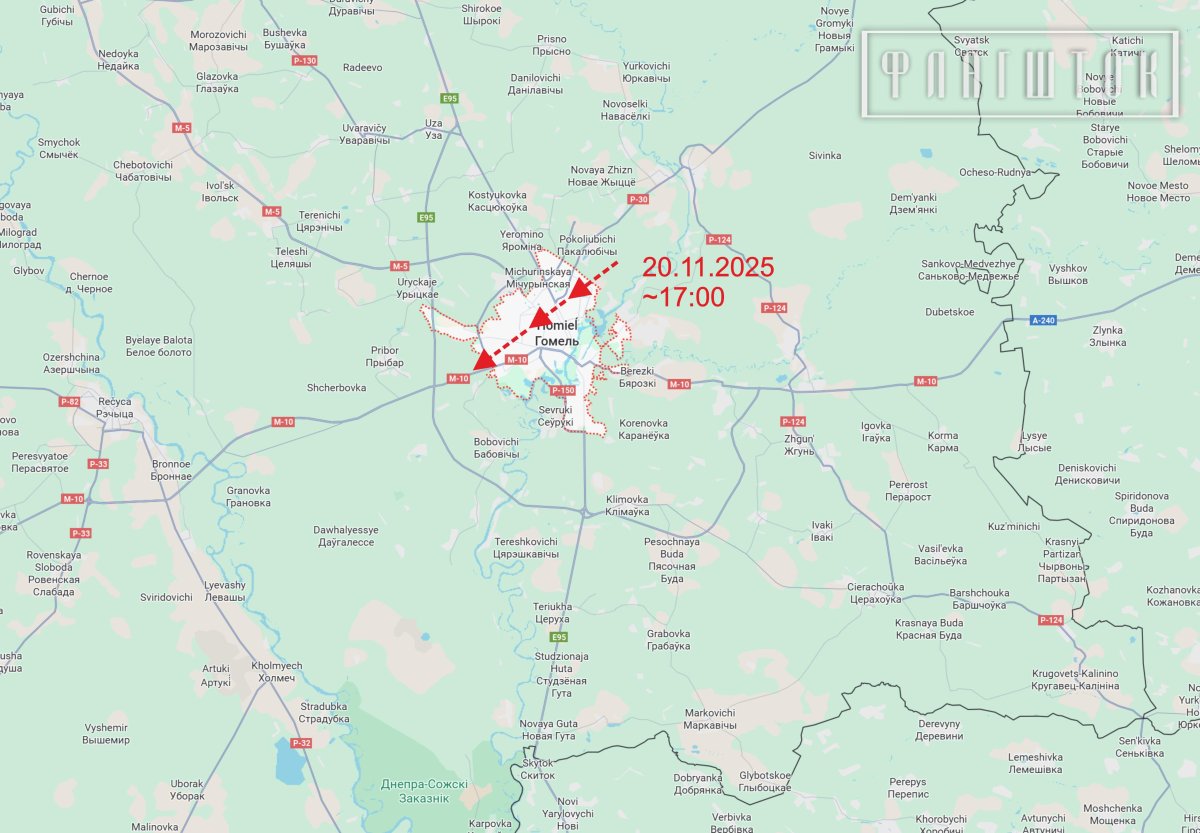 Неизвестный дрон, по звуку и внешнему виду похожий на российский «Шахед», видели над Гомелем вечером 20 ноября. Около 17:00 на очень низкой высоте БпЛА проследовал через микрорайон «Кленковский». Спустя считанные минуты его наблюдали в микрорайоне «Сельмашевский».