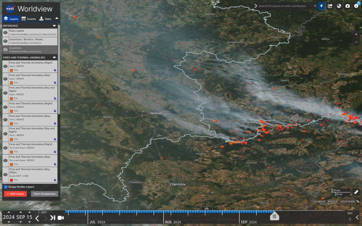 Гомельщина и пожары на пограничье Украины и России. Снимок сервиса Worldview от NASA на 15 сентября