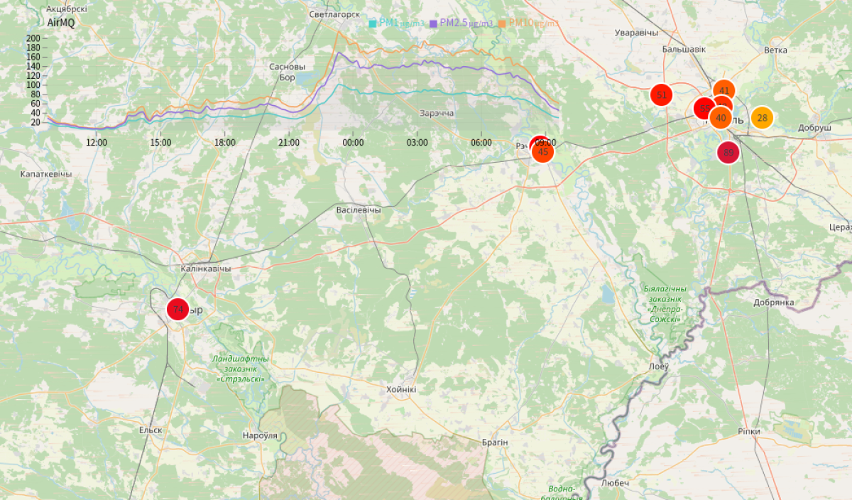 На утро 16 сентября ситуация улучшилась. Наиболее сильное загрязнение воздуха отмечалось в Новобелицком районе. Также высокий показатель содержания твердых частиц в воздухе был показан в Мозыре.