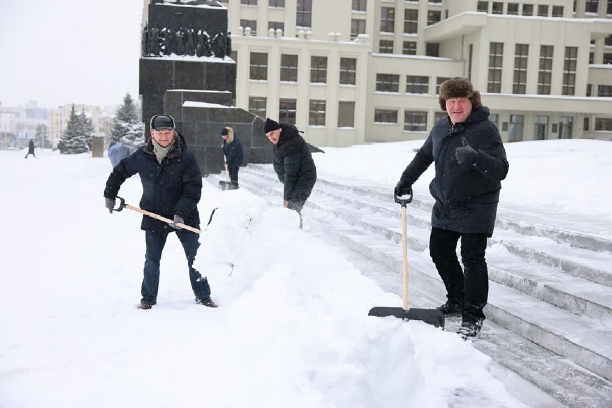 Цилько (справа) напоказ убирает снег у здания парламента. Фото: Threads