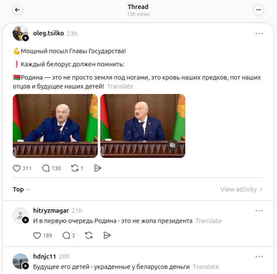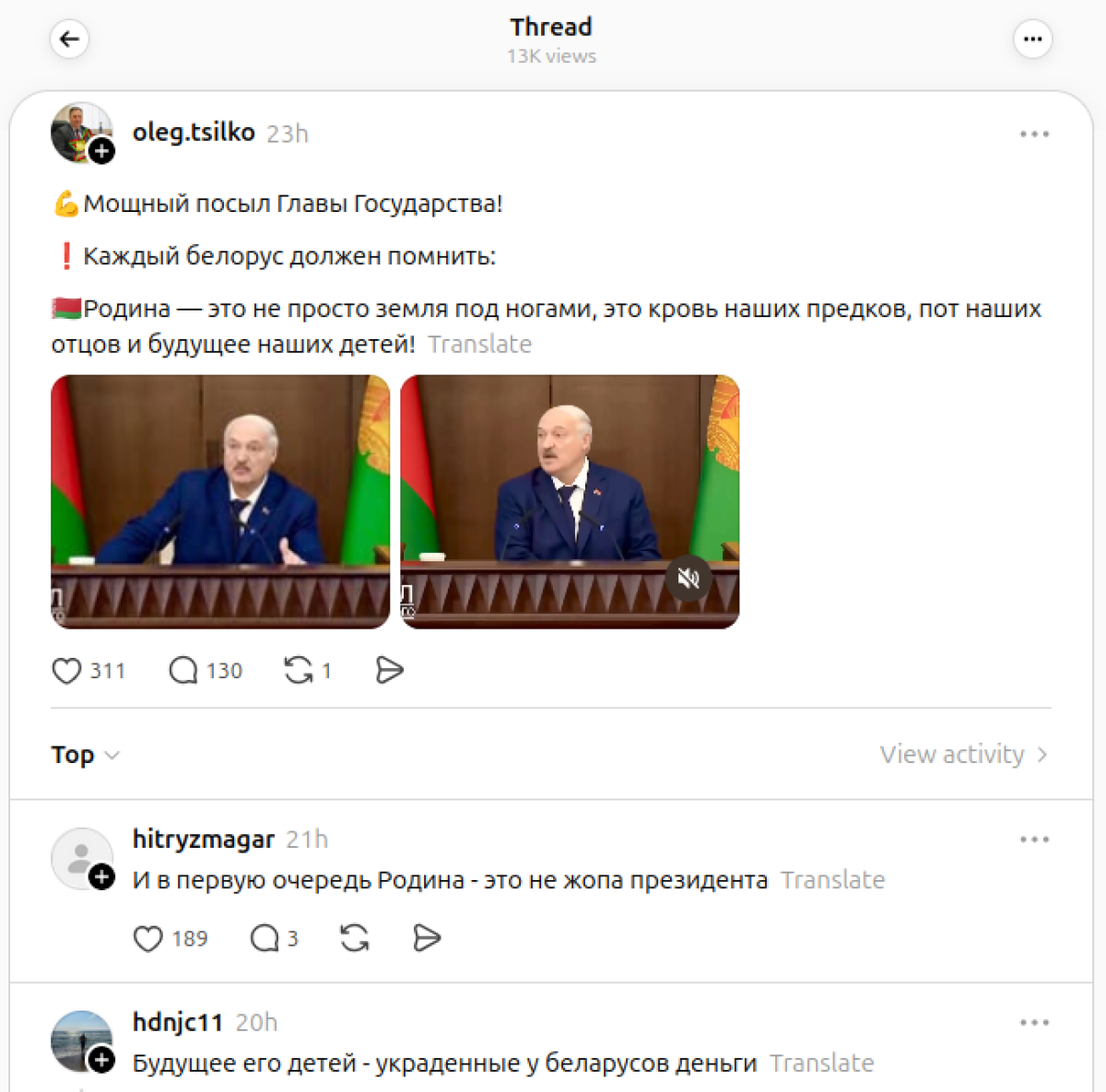 Но с Threads так не получилось. Как заметил Флагшток, все посты Цилько получали единичные реакции до тех пор, пока он не запостил видео с Лукашенко и подписью «Мощный посыл Главы Государства! Каждый белорус должен помнить: Родина — это не просто земля под ногами, это кровь наших предков, пот наших отцов и будущее наших детей!»
