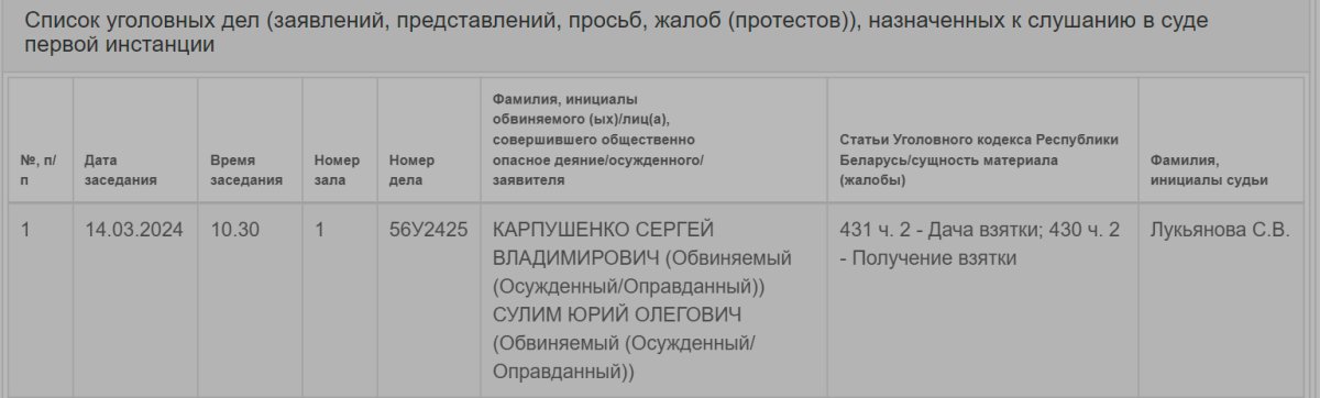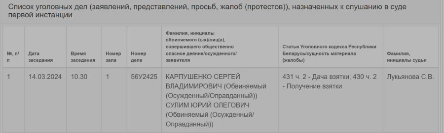 В расписании суда Добрушского района появилось новое коррупционное уголовное дело. По обвинению в получении и даче взятки 14 марта начнут судить Сергея Карпушенко и Юрия Сулима. Кто это такие, рассказывает Флагшток.