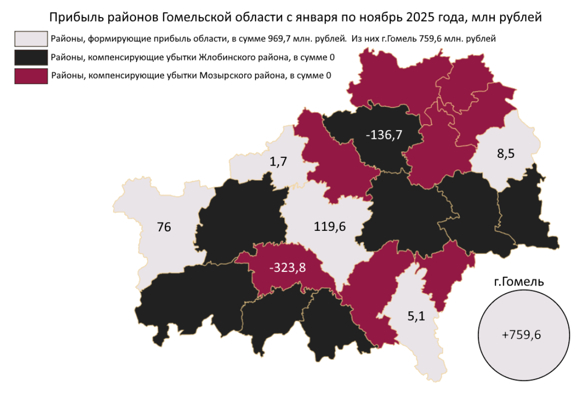 При этом город Гомель остаётся главным донором: именно за счёт его предприятий область в целом формирует прибыль. Остальные районы чаще демонстрируют символические плюсы, либо находятся в статистической нейтральности.