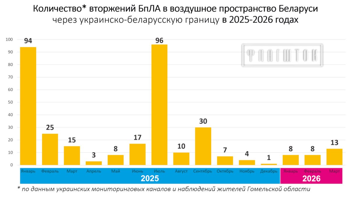 Таким образом, ситуация стала более запутанной, но можно констатировать, что минимум 13 БпЛА нарушали воздушное пространство Гомельщины в марте. Вероятно, в приграничье Гомельщины стали замечать не только российские, но и украинские БпЛА.