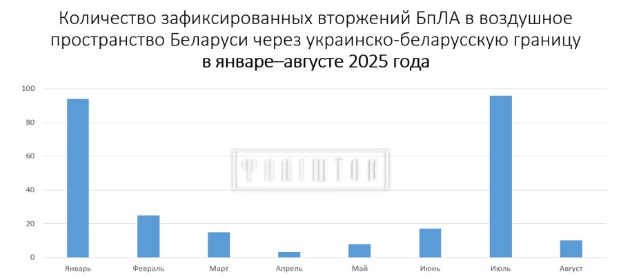 Инфографика Флагштока: количество зафиксированных вторжений БпЛА в воздушное пространство Беларуси через украинско-беларусскую границу в январе–августе 2025 года