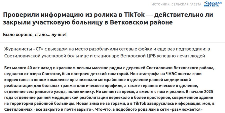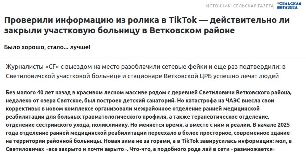 После того, как Флагшток рассказал о появившемся видео с кадрами частично заброшенной территории Светиловичской участковой больницы в Ветковском районе, государственная «Сельская газета» заявила, что «опровергает фейк», и что «было хорошо, а стало лучше».