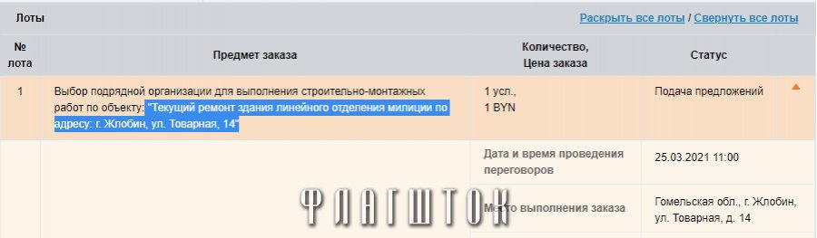 В данном материале была информация, что в Жлобине проводится тендер по выбору подрядной организации для выполнения строительно-монтажных работ по объекту: «Текущий ремонт здания линейного отделения милиции по адресу: г. Жлобин, ул. Товарная, 14». Особенность тендера в том, что закупка строительных работ осуществляется на деньги Евросоюза. Организатором тендера выступает Частное социально-информационное учреждение «Поддержка прогрессивных инициатив».