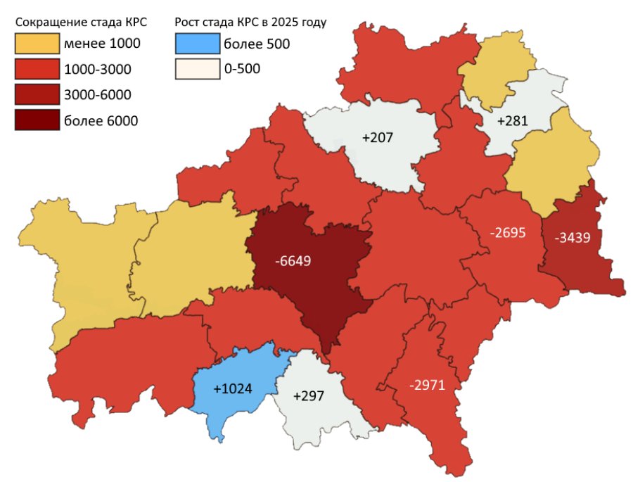 По итогам 2025 года общее поголовье крупного рогатого скота (КРС) в области сократилось на 29 463 головы или –4,95% по сравнению с началом года. Это вдвое более глубокий спад, чем в 2024 году, когда сокращение поголовья составило около 12 702 головы (–2,09%).