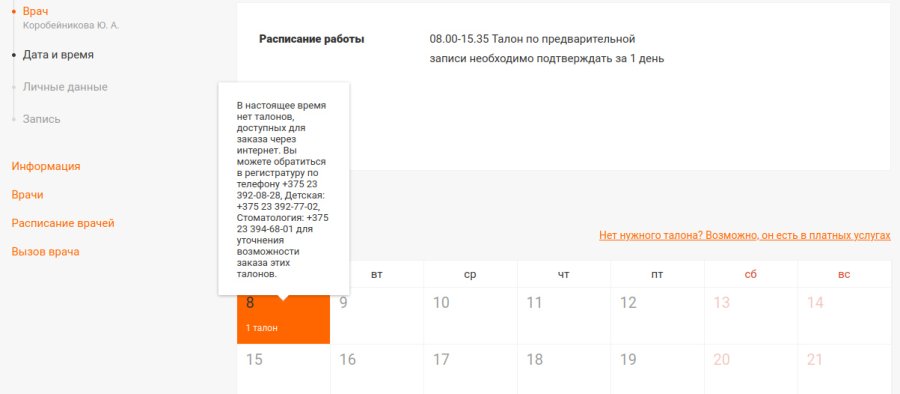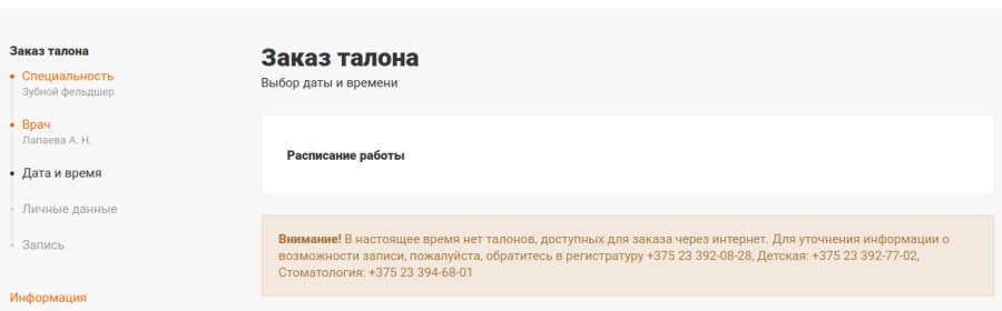 Флагшток попробовал дозвониться в регистратуру поликлиники Рогачевской ЦРБ, но так и не дождался ответа специалиста — каждый раз автоответчик сообщал, что «все операторы заняты». Также мы проверили, возможно ли записаться к врачам через сервис Талон.бай — оказалось, что действительно талонов на эту неделю практически нет. Например, к единственному врачу-неврологу записи нет на всю неделю, а один талон на понедельник, указанный на сервисе, оказался недоступен для заказа через интернет.