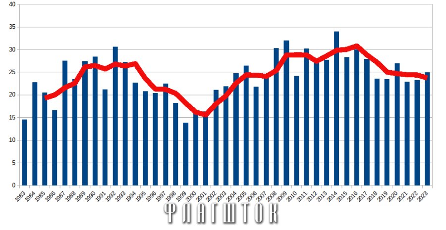 Построение скользящей средней (усредненный показатель урожайности за три года, что позволяет снизить влияние погодных факторов) показывает постепенное снижение эффективности происходит с 2016 года. Предыдущее продолжительное падение произошло после того, как бывший аграрий Александр Лукашенко занял высшую государственную должность.