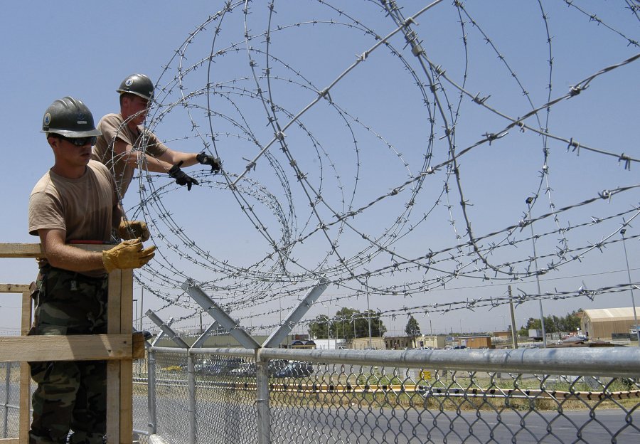 Создание мер безопасности выглядит так: по периметру объекта устанавливают железобетонный забор, под ним — противоподкопную решетку из арматуры. За забором ставят периметральное ограждение из 3D-сетки, а по верху прокладывают «Егозу», колючую проволоку.