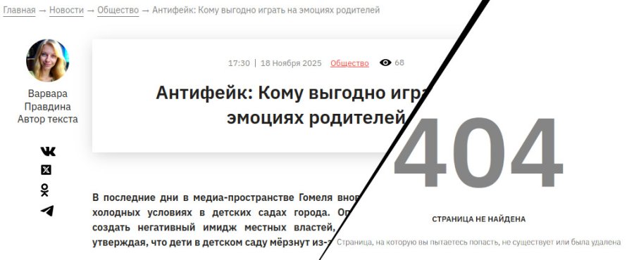 Вечером 18 ноября газета Гомельского горисполкома выпустила «антифейк», но уже через час удалила публикацию, заметил Флагшток. Она осталась в сохраненной копии в Яндексе.