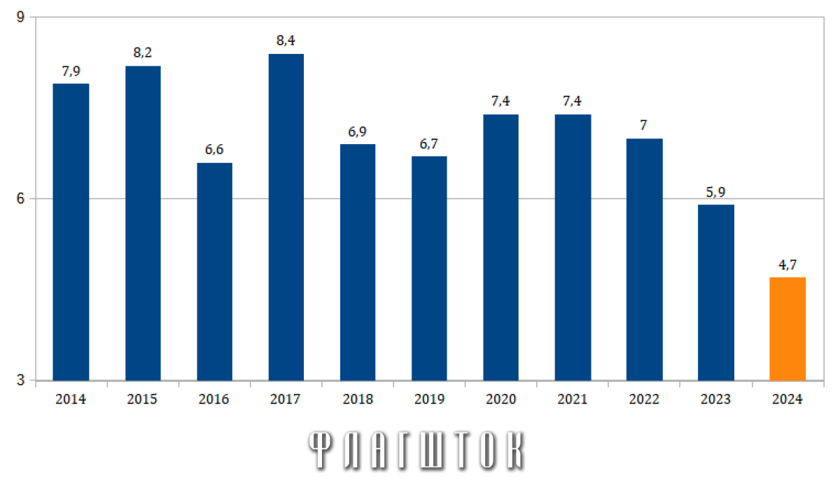 Рентабельность продаж в сфере сельского хозяйства по итогам 7 месяцев 2024 года составила –0,5%. Последний раз убыточность сельского хозяйства фиксировалась в 2021 года. В тот год сельское хозяйство так не смогло выйти на окупаемость до конца года.