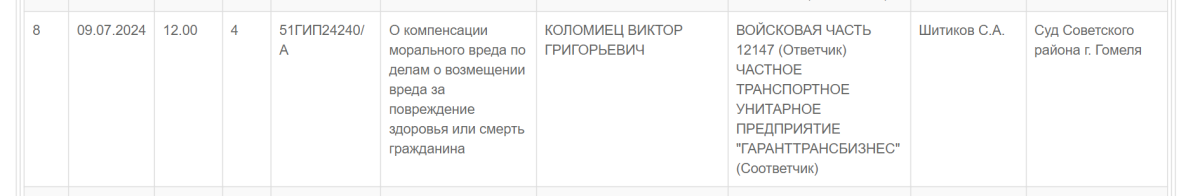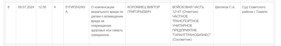 В Гомельском областном 9 июля рассматривается жалоба на решение суда Советского района по иску к войсковой части о компенсации морального вреда. Истцом указан Виктор Коломиец — вероятно, это отец Сергея Коломийца, который погиб в конце 2022 года, врезавшись в военный «ЗиЛ».