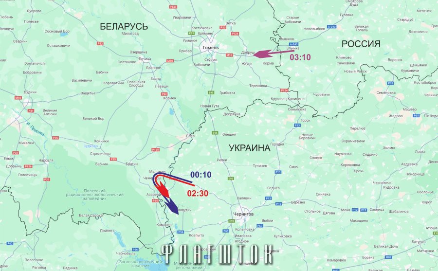 При этом два «шахеда» проследовали транзитом: вошли через Любеч Черниговской области (в 00:10 и в 02:30), затем, не долетая до Брагина, повернули на юг в сторону Славутича, сообщил Флагштоку мониторинговый канал @eRadarrua. Третий российский беспилотник зашел не с территории Украины, а напрямую из РФ — примерно в 03:10–03:15 через Злынку (Брянская область) и пропал в районе Добруша на территории Беларуси. Что с ним случилось — пока неизвестно.