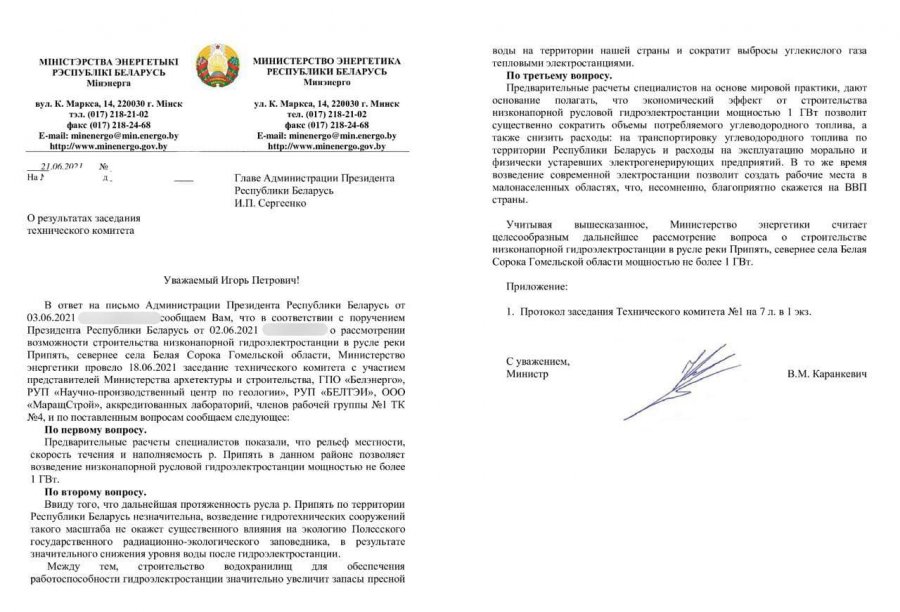 Сегодня в тг-канале МотолькоПомоги опубликован документ «Минэнерго», направленный главе администрации президента Игорю Сергеенко о результатах заседания технического комитета по оценке возможности строительства низконапорной гидроэлектростанции в русле реки Припять. Подписал документ министр энергетики Виктор Каранкевич. Инициировал вопрос постройки ГЭС Александр Лукашенко 2 июня 2021 года.