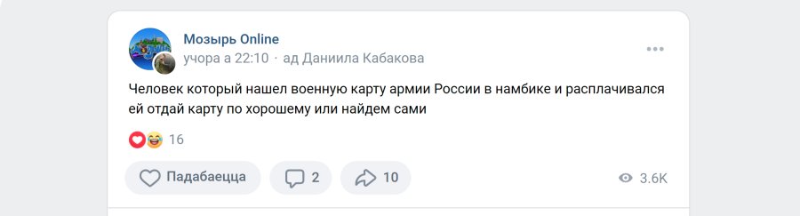 Объявление опубликовал росcийский военнослужащий — 19-летний Даниил Кабаков. Карта была утеряна в «Намбике» (ночной клуб NumberOne в центре Мозыря). После утери карты Кабаков заметил, что с нее стали списываться средства. В объявлении он пригрозил нашедшему: «...отдай карту по-хорошему или найдем сами».