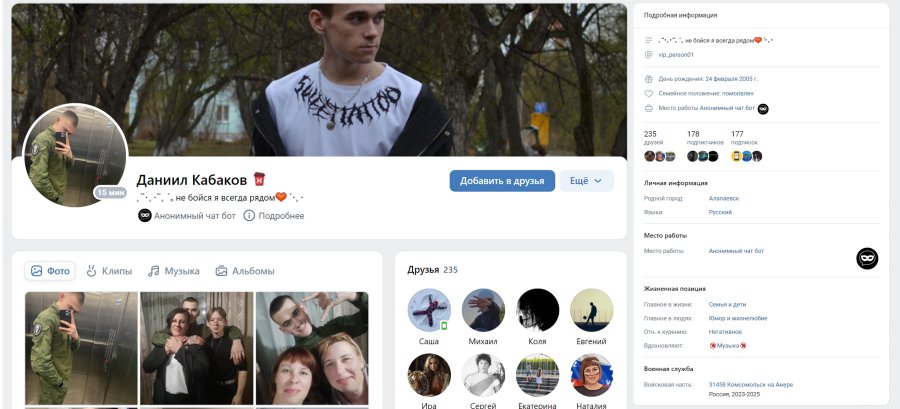 Родился Кабаков в Алапаевске — депрессивном городе Свердловской области РФ. В описании своего профиля он оставил настоящие имя и фамилию. Кроме того, указал номер настоящей ВЧ, в которой состоит: военная часть № 31458. Это условное название 1530-го зенитного ракетного полка, расположенного в Комсомольске на Амуре (Хабаровский край РФ). Солдат также указал и время службы: 2023–2025 годы.