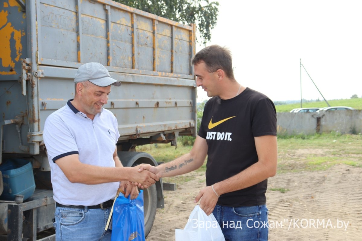 Директор КСУП «Ново-Зеньковский» Максима Громовича (справа) награждает работника предприятия. Фото: Зара над Сожам