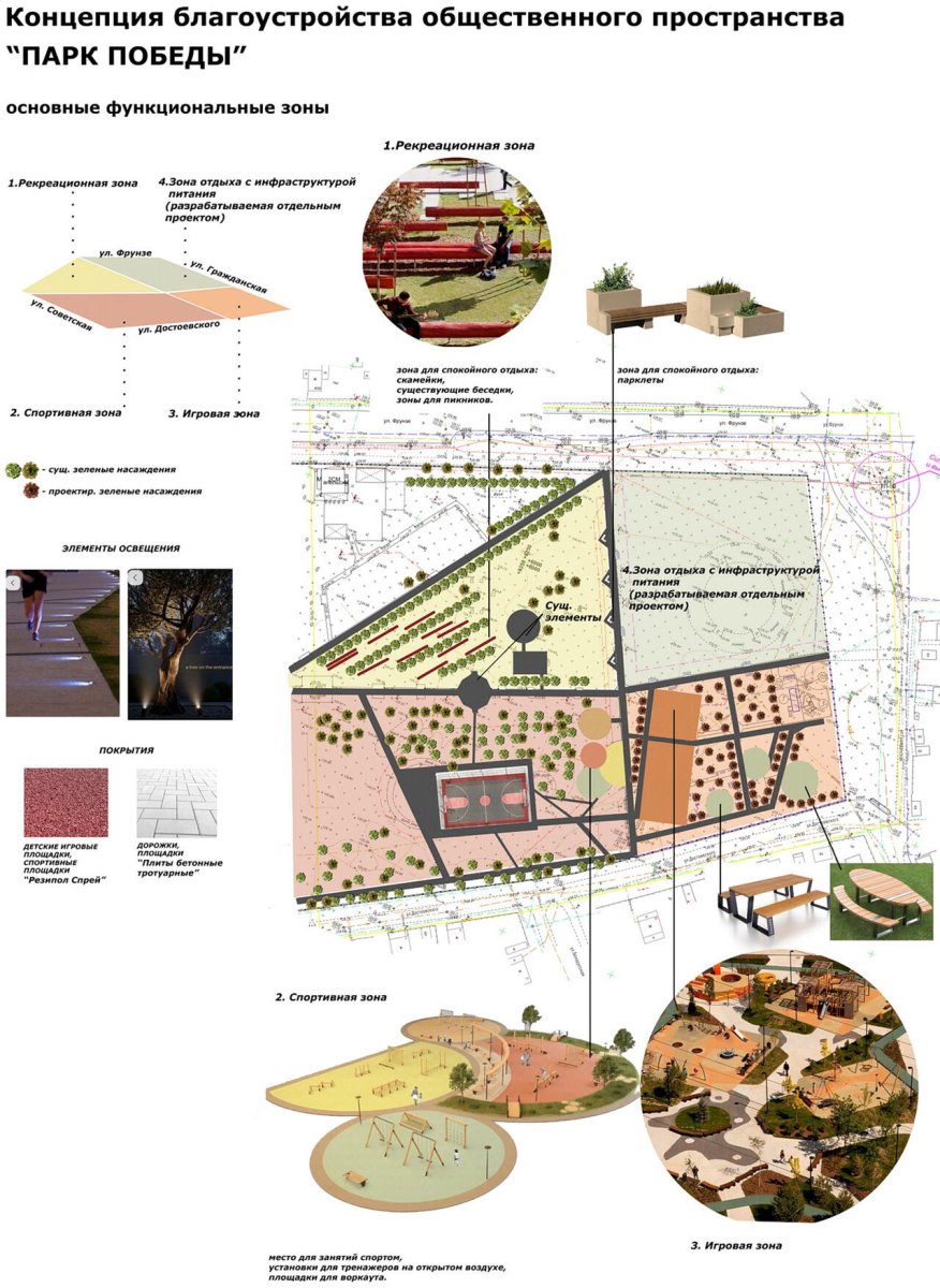 Сообщается, что реализация объекта пройдет в четыре этапа и будет включать в себя устройство скейтпарка и воркаут площадки, обустройство существующих беседок, объединение этих зон пешеходными дорожками, установку уличных спортивных тренажеров.