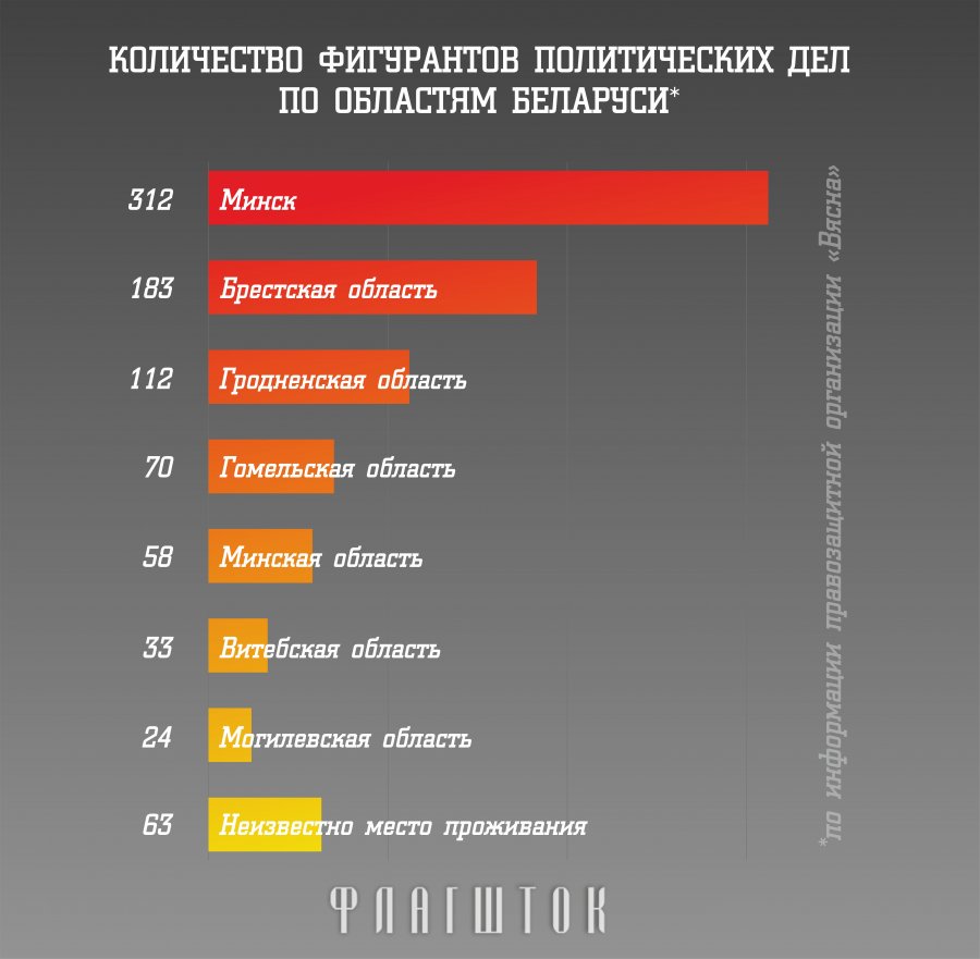 На основе статистики правозащитного центра Вясна, издание Наша Ніва посчитало количество фигурантов политических уголовных дел. Согласно этим данным, больше всего пострадавших от политических репрессий в поствыборный период насчитывается в Минске. Затем идут Брестская и Гродненская области. На 4 месте — Гомельский регион. Но данные по Гомельской области не соответствуют официальным — количество криминальных дел по региону, связанных с протестами, в несколько раз больше.